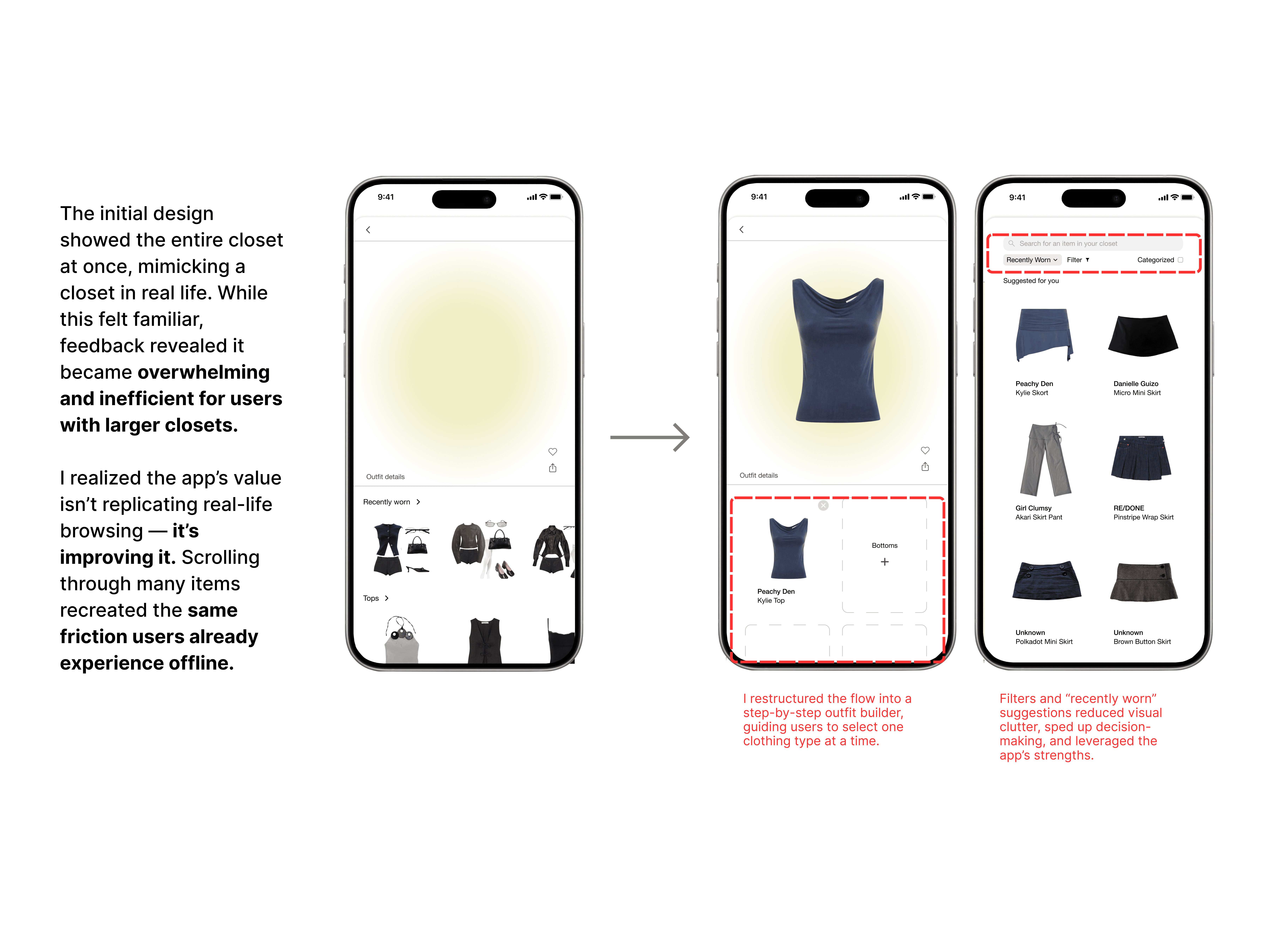 Designing for Scale โ This project challenged me to think beyond single interactions and design for scale. As wardrobes grew, patterns like overwhelm and inefficiency emerged, which pushed me to structure flows, introduce filters, and guide users through decisions.